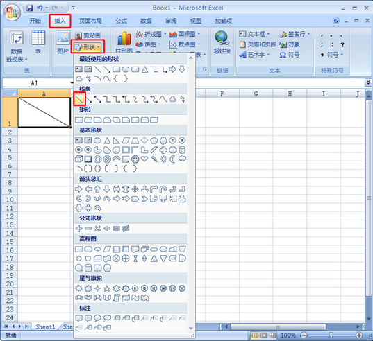 4.有時(shí)候可能需要在表頭中繪制多條斜線,那么怎么來(lái)插入其他的斜線呢?選中需要繪制斜線的單元格,單擊“插入”-“插圖”-“形狀”按鈕,在彈出的下拉框中選擇“線條”組中的“直線”。