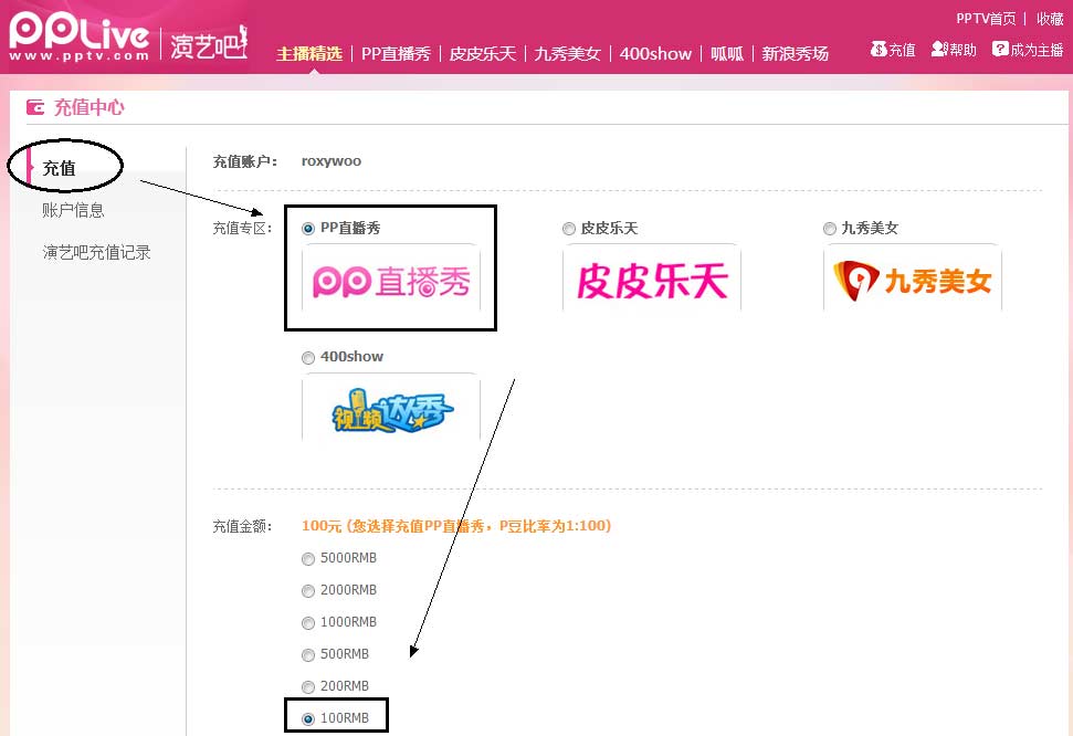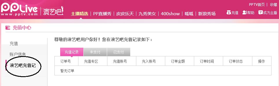 1、從PPlive演藝吧首頁,一級導(dǎo)航欄【充值】進入;