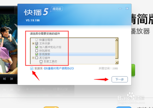 如圖,這就是安裝界面,要注意的是框框里的勾,有一些是用不到的把它去掉,這樣就不會(huì)浪費(fèi)內(nèi)存了。但是下面協(xié)議的勾勾一定要打上去哦,不然進(jìn)行不了下一步的。