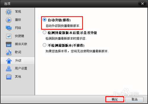 在右側選中“自動升級”項,然后點擊下方的“確定”按鈕,這樣當有新版本時候,系統(tǒng)就會自動升級了。