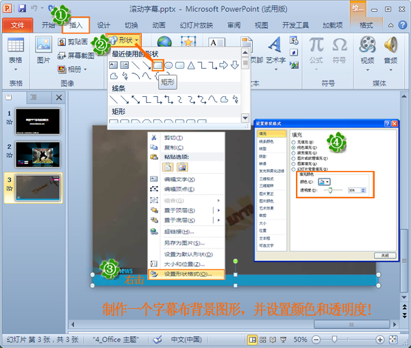準(zhǔn)備添加字幕了,為了好看些,我們也可以添加一個(gè)淺色圖形,做為背景圖片。步驟是點(diǎn)擊“插入”,下拉菜單中選擇“形狀”,會(huì)出現(xiàn)很多的樣式形狀。選擇矩形,然后在幻燈片上的視頻下方畫出一個(gè)矩形來。
