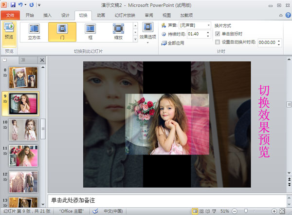 為每一張幻燈片設(shè)置一種切換特效。依次選中幻燈片,然后在“切換”中為每一張幻燈片都選擇上任意一種切換效果,這樣幻動(dòng)片相冊(cè)在播放的時(shí)候就會(huì)更生動(dòng)。