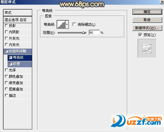 斜面和浮雕:高光及陰影的顏色都為白色,其它設(shè)置如下圖。