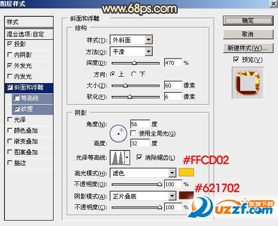 斜面和浮雕:高光顏色為橙黃色:#ffcd02,陰影顏色為:#621702,其它設(shè)置如下圖。