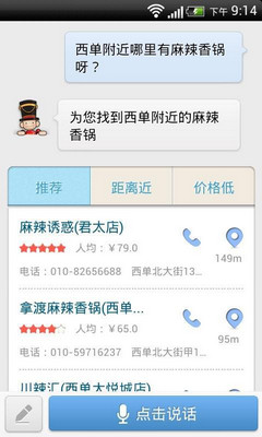 當然只有以上功能還是不夠的哦,如果跟朋友外出逛街想吃美食了,可是一時間又尋不到好地方,沒關系,問問搜狗語音助手吧!如下圖所示,比如小編問“西單附近哪里有麻辣香鍋呀?”搜狗語音助手馬上就為小編找到了西單附近的麻辣香鍋,比上網(wǎng)搜索更方便快捷哦!