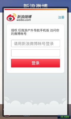 第四步:如果我們想進行照片微博分享,我們可以點擊微博分享按鈕,首先軟件會提示通過新浪還是騰訊微博進行分享。我就拿新浪微博分享吧,點擊新浪微博,彈出一個授權(quán)對話框,需要將你自己的新浪微博賬戶和密碼輸入好登錄即可進行微博分享。進入照片分享,我們可以將自己想要說的話輸入到輸入框中,然后點微博分享按鈕,這樣一張帶有GPS信息的照片就被分享到微博上了。如下圖所示: