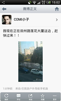 另外我們分享到微博上的照片,同樣也可以將通過微博保存到你手機上,再次進行照片導航。方法很簡單,只要你手機也同樣裝有任我游戶外導航軟件,那么只要打開手機微博,將我剛才剛分享的微博照片查看原圖并保存到手機上,接下去,我們將保存的照片找到并拷貝到Gou目錄下的“來自分享”文件夾里,然后再打開導航軟件,進入到照片導航打開來自分享,就能夠看到我剛從微薄上保存下來的照片,并且更加神奇的事,這張照片也可以進行照片導航。如下圖所示: