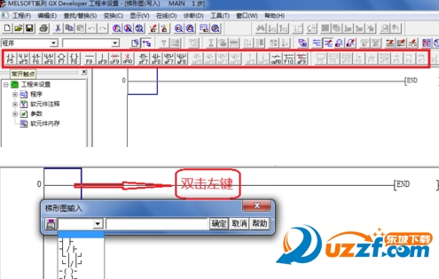 4、接下來就可以 開始編寫PLC梯形圖程序了。我們可以在工具欄中找到相應(yīng)的輸入輸出等符號,點(diǎn)擊就可以添加到程序編輯器中,也可以在編輯器中雙擊左鍵,輸入相應(yīng)的符號,如下圖所示: