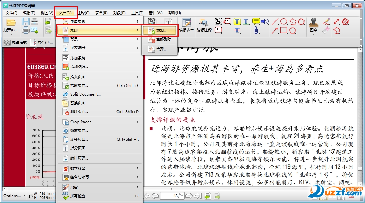 通過以上方法,可以為PDF文件添加水印。若是需要為文檔添加水印或背景,同樣在軟件菜單欄上,“文檔”的下拉選項中設置即可。
