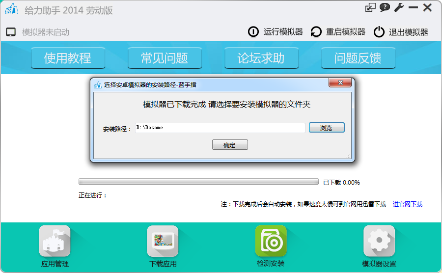 4、瀏覽選擇模擬器安裝路徑(軟件只是將模擬器和給力助手捆綁在了一起,無需再次下載模擬器)