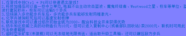 3.全部科技:打開各個(gè)國(guó)家的科技樹,可以建造所有國(guó)家的建筑、武器。注意:開啟“科技全開”以后,在《紅色警戒2》的聯(lián)機(jī)對(duì)戰(zhàn)中不要加入電腦玩家,否則電腦玩家會(huì)做出“出格”的事情,造成各個(gè)游戲端AI數(shù)據(jù)不一致而導(dǎo)致連線斷開!《尤里的復(fù)仇》里面貌似沒有這樣的問題,主要是官方對(duì)《紅色警戒2》的AI設(shè)置問題。。。