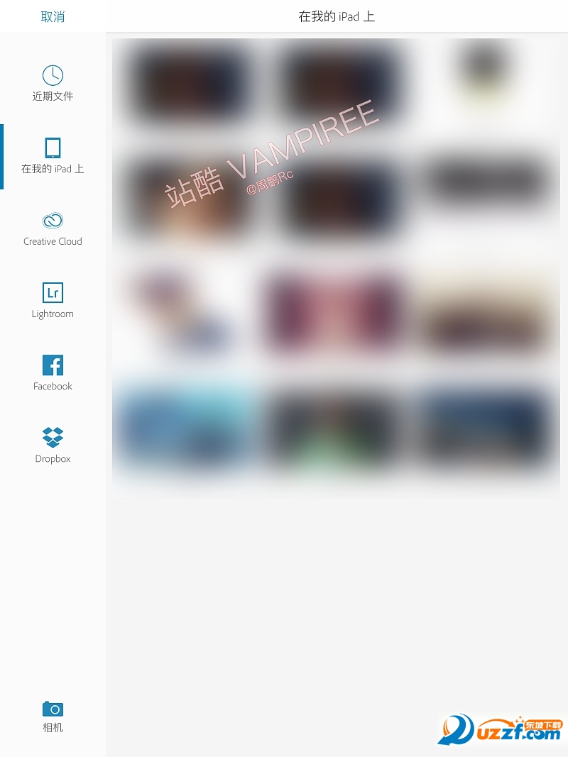 我們可以此頁(yè)面預(yù)覽以及添加近期圖片在你移動(dòng)設(shè)備上的圖片 以及Creative Cloud上的文件 如果你有該賬號(hào)便可以添加云端處理文件Lightroom(Adobe旗下調(diào)片軟件)里面的片子 以及非死不可上的 還有Dropbox 最主要的是可以直接拍照在處理完美
