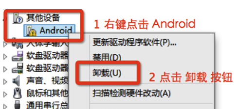 1、在電腦的「設(shè)備管理器」中找到「其他設(shè)備」,點擊該項目后會出現(xiàn)「Android」或其他設(shè)備,右鍵單擊驅(qū)動并在彈出菜單中選擇「卸載」。